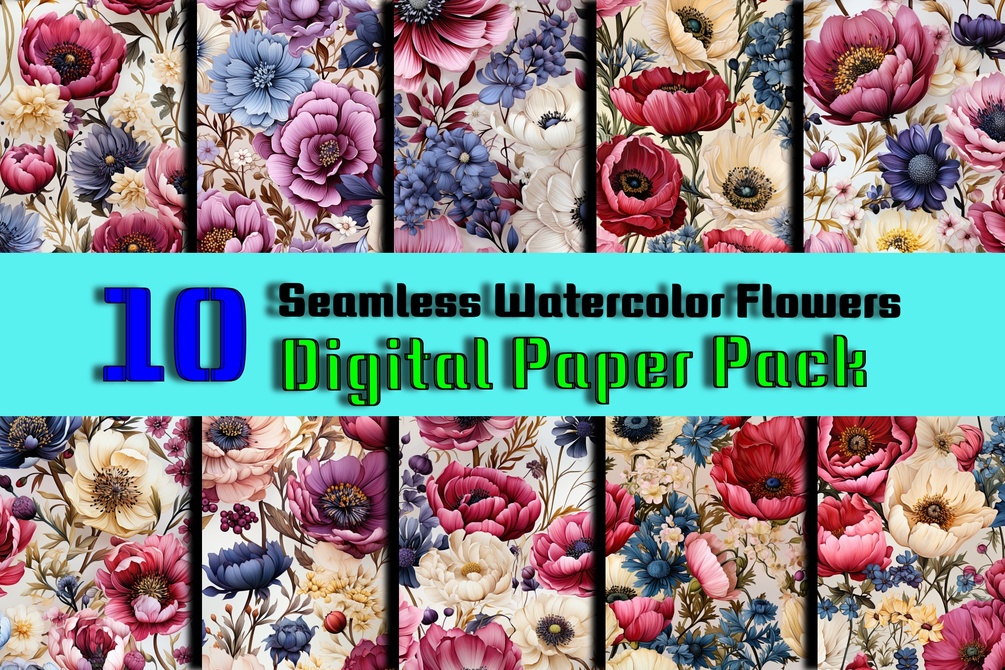 10 seamless detailed beautiful watercolor flowers digital paper pack.